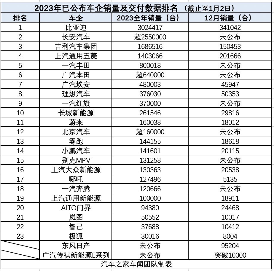 2024-01-03 10:01:142024年新年伊始,各大车企公布2023年销量及交付数据,我们也对目前已经公布的全年销量及交付数据进行排名,截止至1月2日,比亚迪,长安 南瓜影院,吉利三大汽车集团位列2023年销量排名前三。