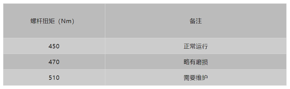 正常/磨损/维护阈值:450 Nm/470 Nm/510 Nm(需维护时>500 Nm)。
