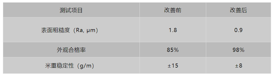改善前后:表面粗糙度从1,8 μm降至0 南瓜影视资源,9 μm,外观合格率从85%提升至98%,米重稳定性提高。。