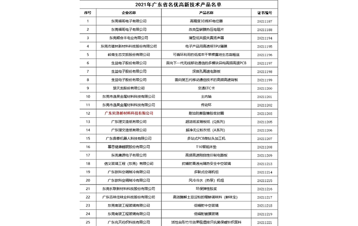 贝洛新材入选2021年广东省名优高新技术产品名单