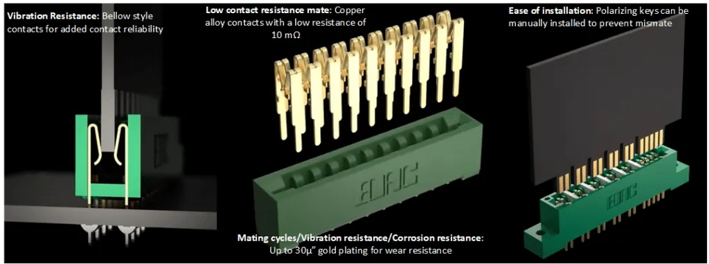 图 2 在线电影院,卡边缘连接器采用波纹管式触头,具有抗振性,铜合金触头具有低电阻,镀金具有耐磨性。(图片:ConnectorSupplier)。