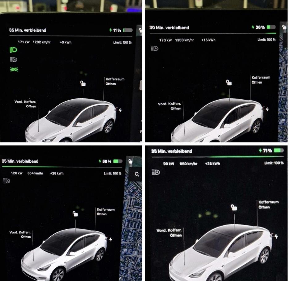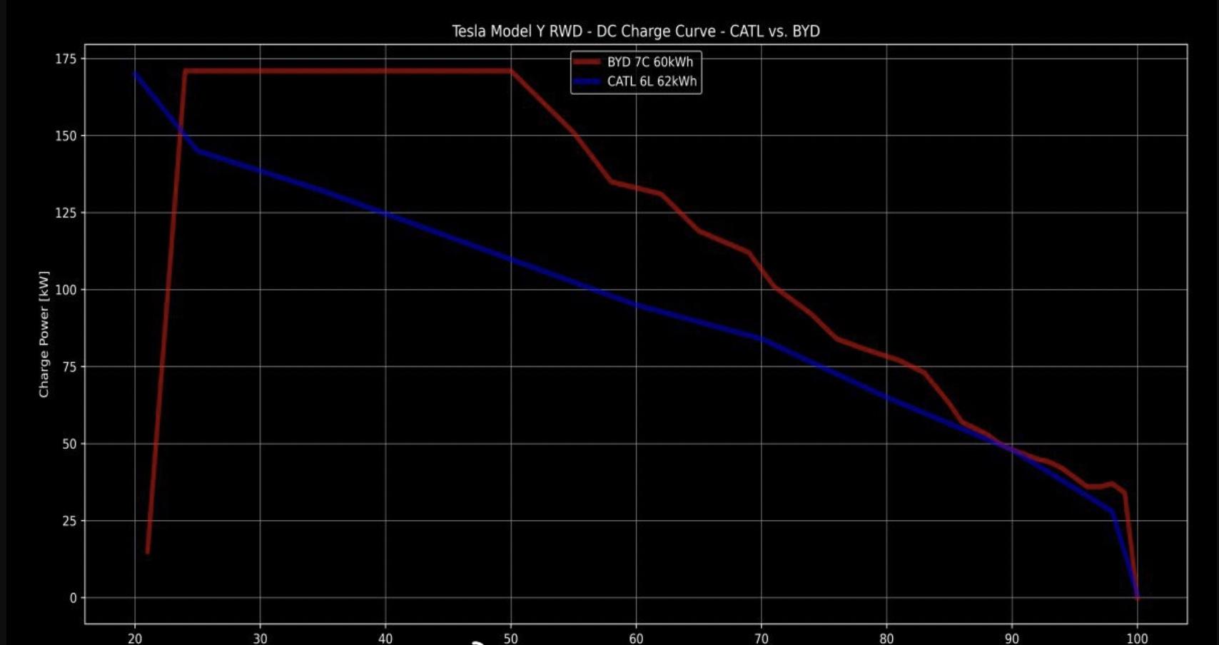 有用户分享了这款车型的实测充电功率数据,刀片电池版本的Model Y充电峰值功率达到170kW以上,15分钟就能从11%充至71% 南瓜影院在线观看,对比宁德时代版本,可以看到比亚迪版本的高功率充电时间维持的更长,充电功率也比较高。