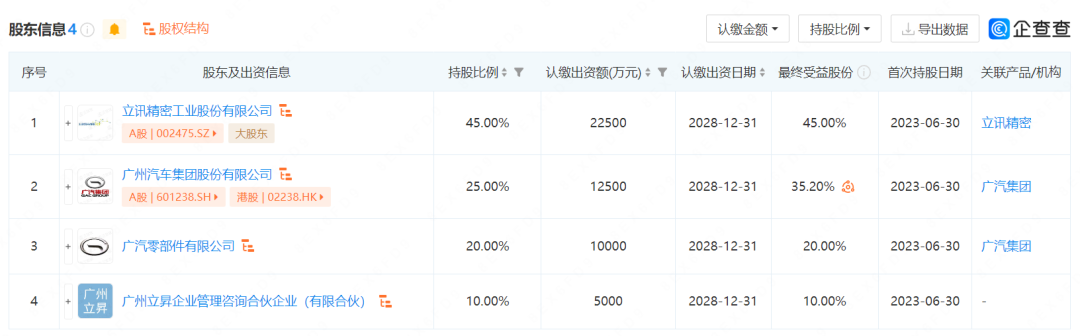 股东信息显示,该公司由立讯精密,广汽集团,广汽零部件有限公司,广州立昇企业管理咨询合伙企业(有限合伙)共同持股 南瓜影视资源,其中,立讯精密持股45%,广汽集团与广汽零部件合计持股45%。